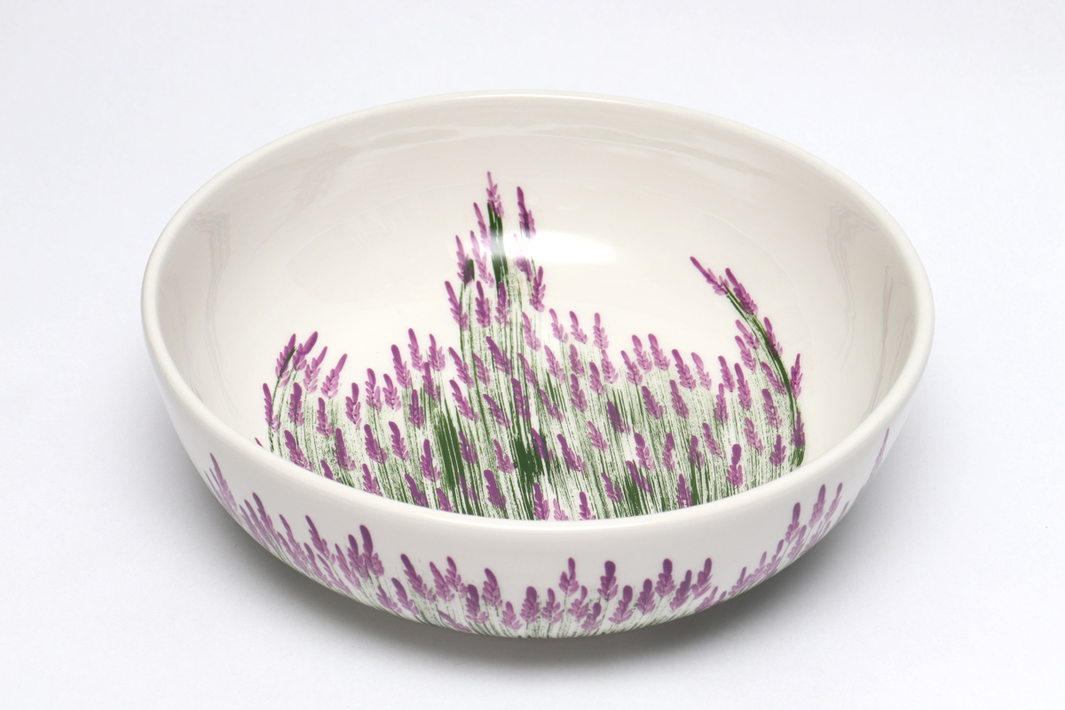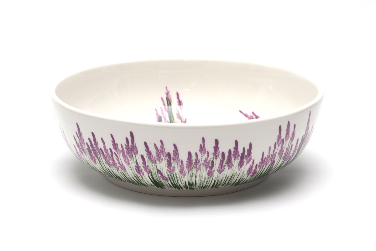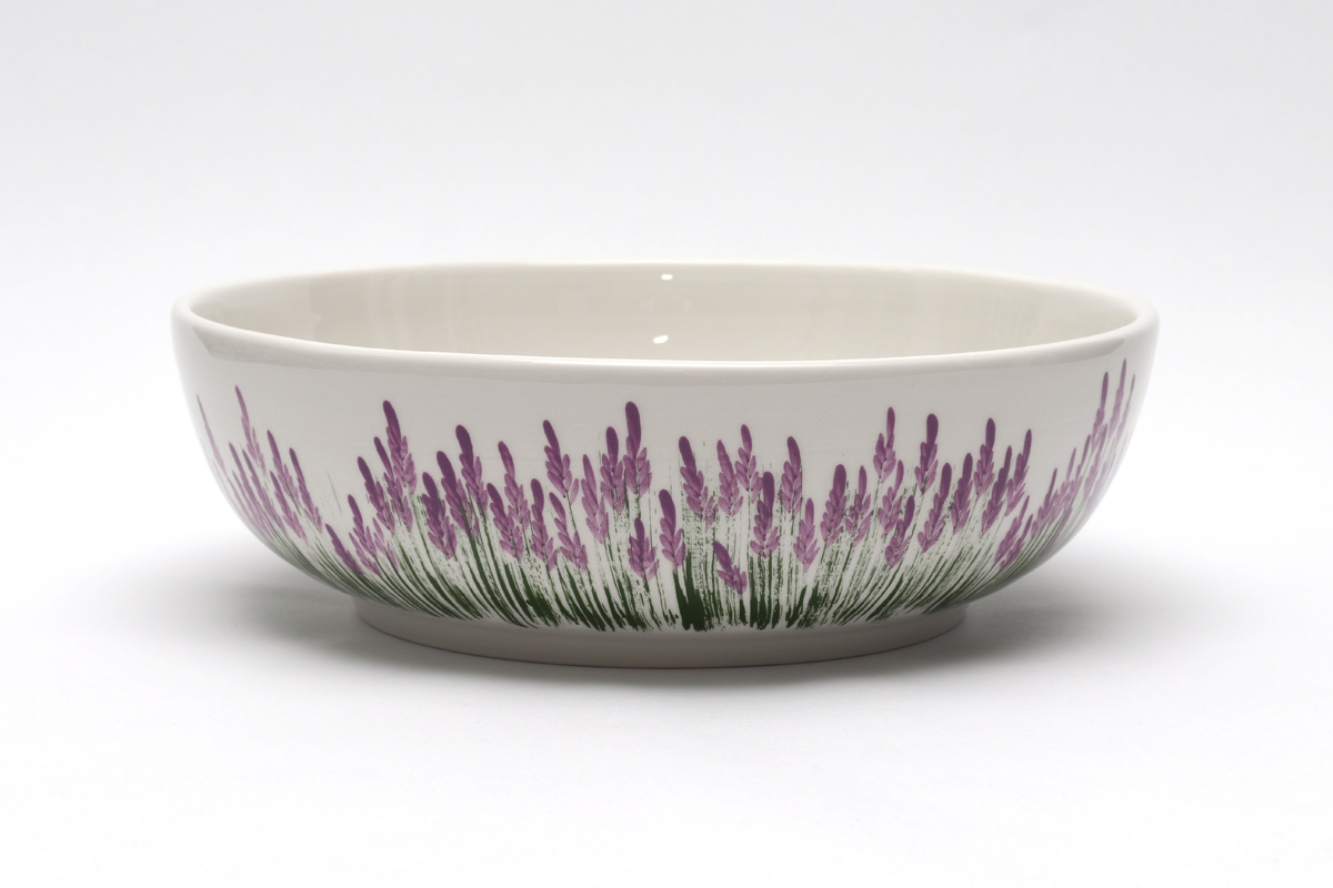 Zdjela od gline s motivom ručno oslikanih cvjetova lavande namjenjena serviranju hrane, salate, voća… Glazirana površina omogućava lakše čišćenje i održavanje. Proizvod je ručni rad hrvatskog majstora lončara, a odlikuje ga visoka kvaliteta i završna obrada.